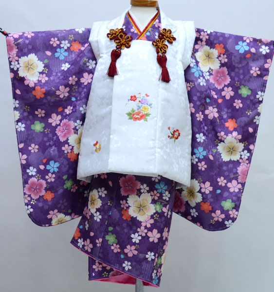 【レンタル】3歳 女の子 正絹 着物 七五三レンタル f1354 被布セット 【絹のお着物】 着物レンタル 753 被布 貸衣装 3才 結婚式 和服 子供着物 人気 モダン かわいい 高級生地 誕生日 hifu 往復送料無料 「式部浪漫」ブランド 紫に絢爛彩り吉祥華